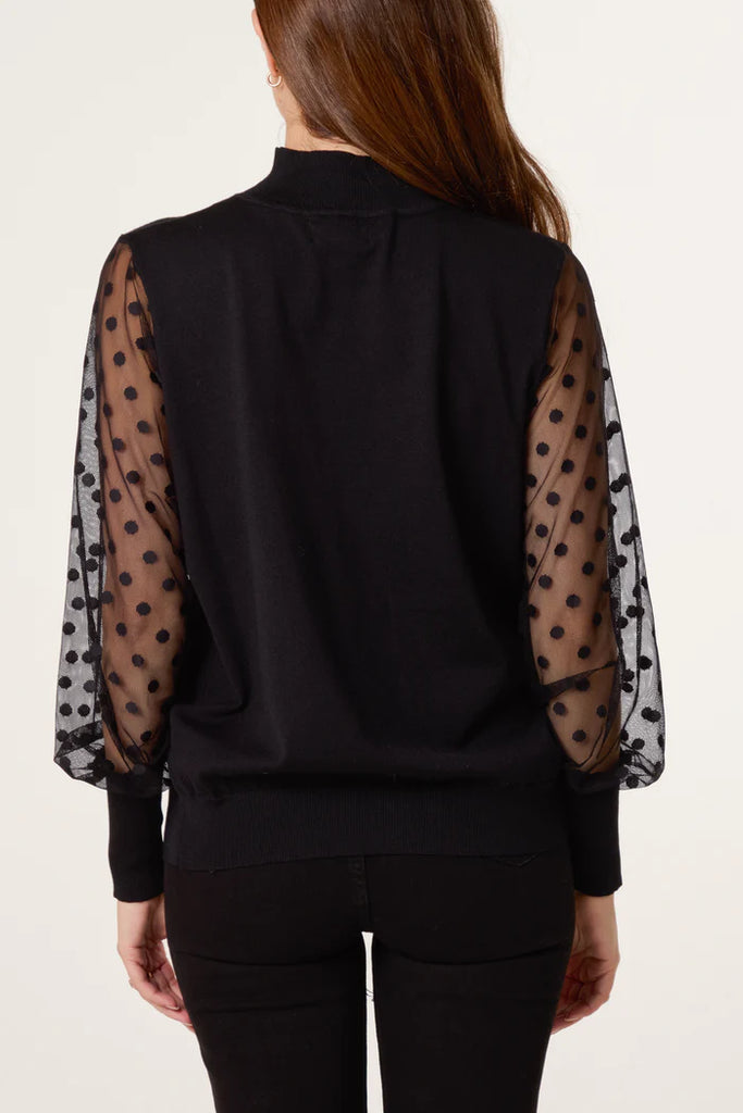 Elevate your everyday wardrobe with the Izzy Jumper, a chic and feminine knit that blends effortless sophistication with contemporary style. Designed with sheer polka dot mesh sleeves and a flattering high turtle neck, this piece offers a perfect balance of elegance and comfort.