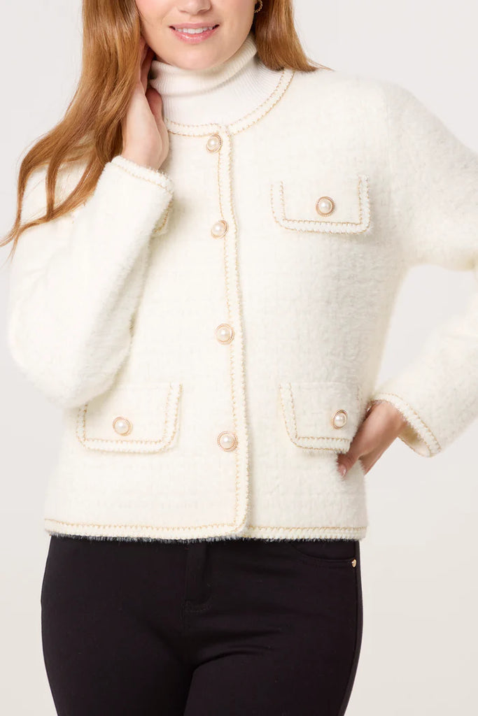 Elevate your everyday style with the timeless elegance of our Laura Pearl Button Cardigan. Designed in a chic ivory hue, this cardigan combines classic tailoring with a touch of sophistication. Featuring pearl-detailed buttons and decorative front pockets, it adds effortless charm to both casual and dressier outfits.