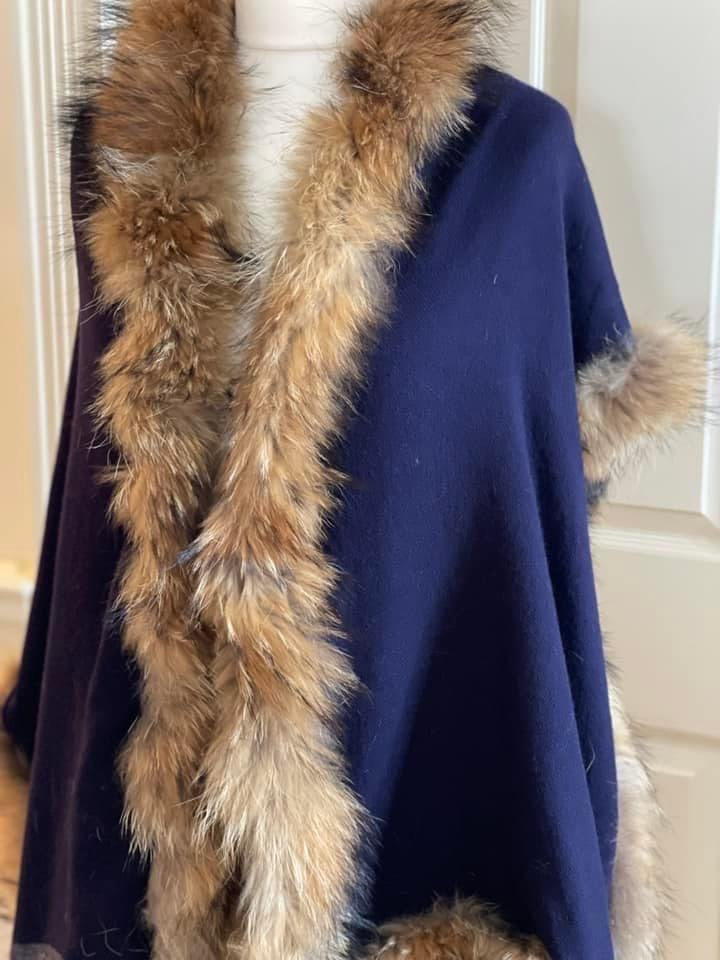 Stunning addition to our wrap collection is this beautiful navy blue wrap with fur trim.