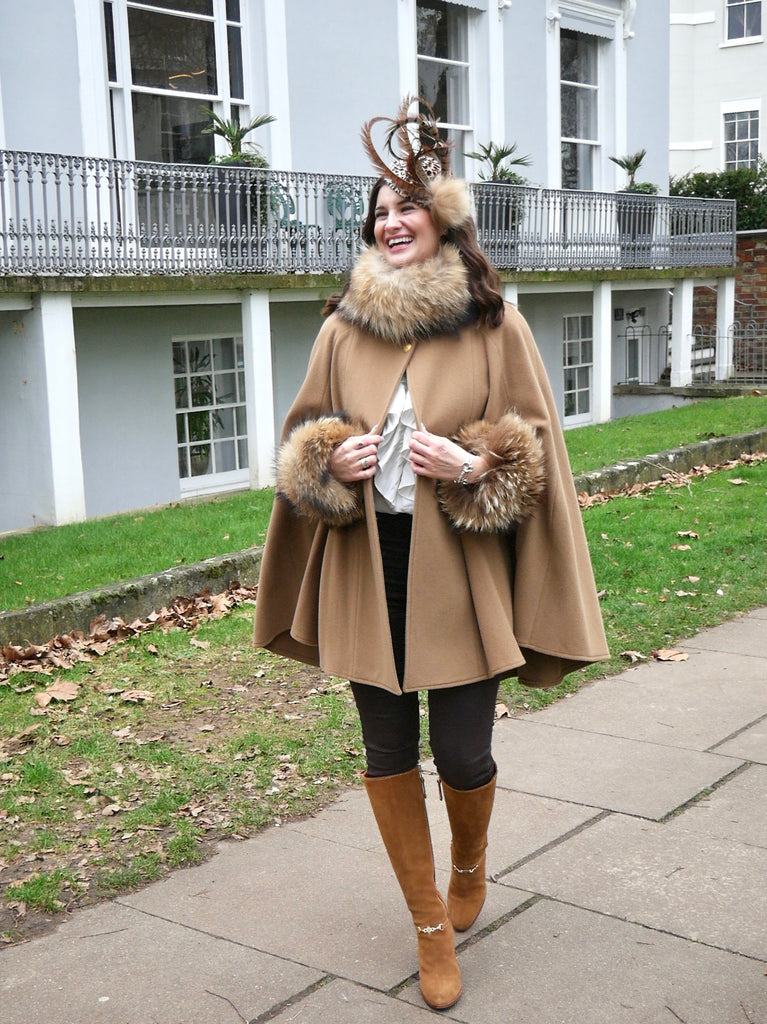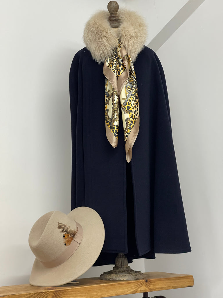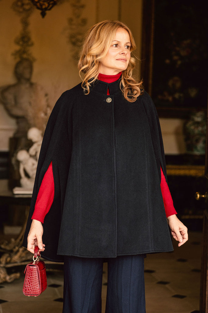 This elegant, unlined cape is made from British wool and has been hand cut and made in England. The close fit across the shoulders ensures comfort and ease of movement.