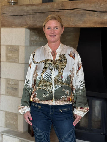 Crafted from a silky-soft blend of 80% viscose and 20% seta, this jacket drapes beautifully, offering a lightweight yet luxurious feel. The eye-catching safari-inspired print, featuring majestic leopards, pheasants, and tropical flora, makes it a true conversation piece for any occasion.