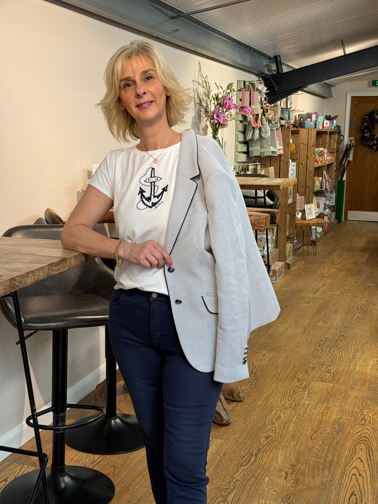 A true wardrobe classic! A short sleeve t-shirt with is super soft with a nautical anchor detailed embroidery. It has a simple crew neck making it a great versatile piece.
